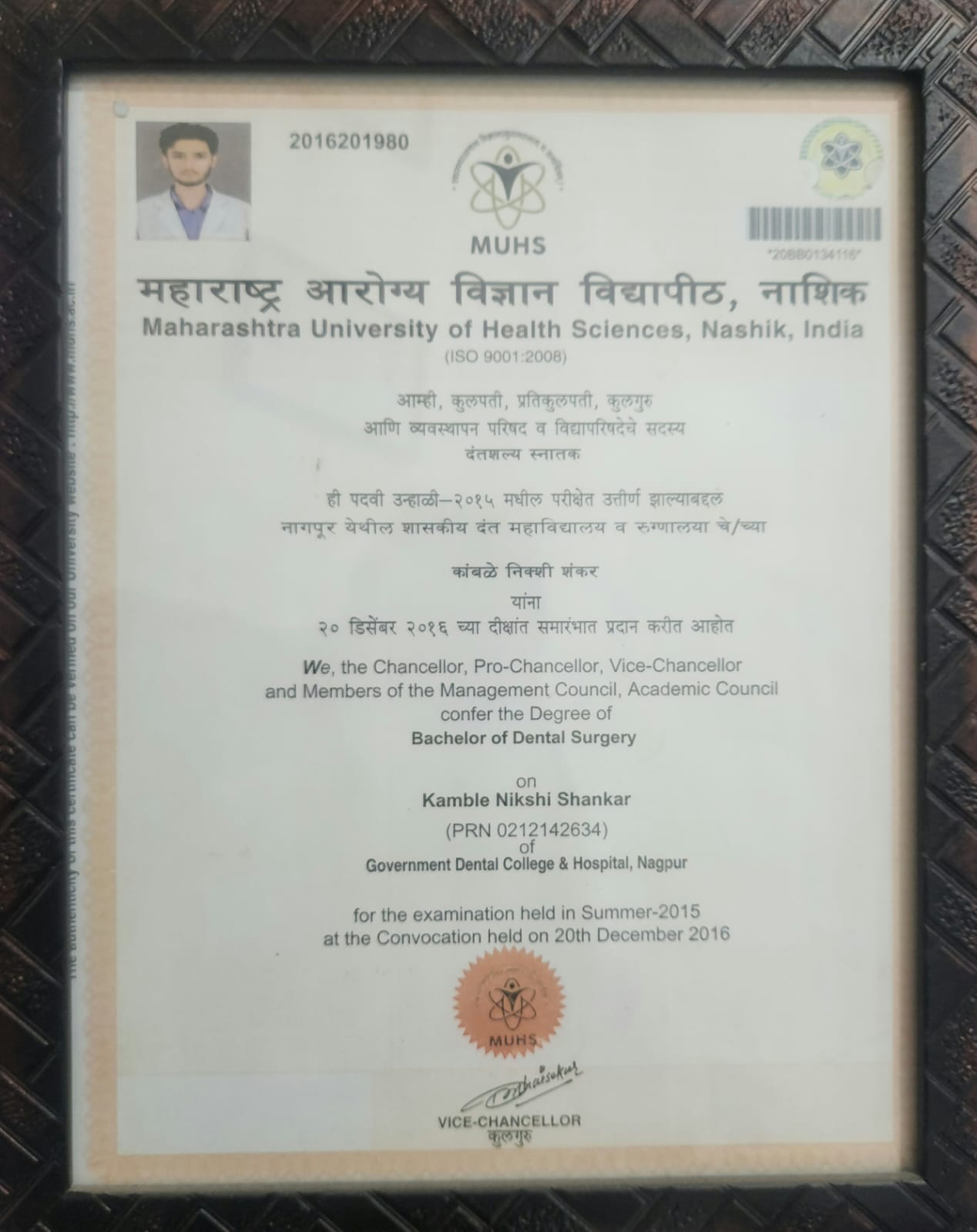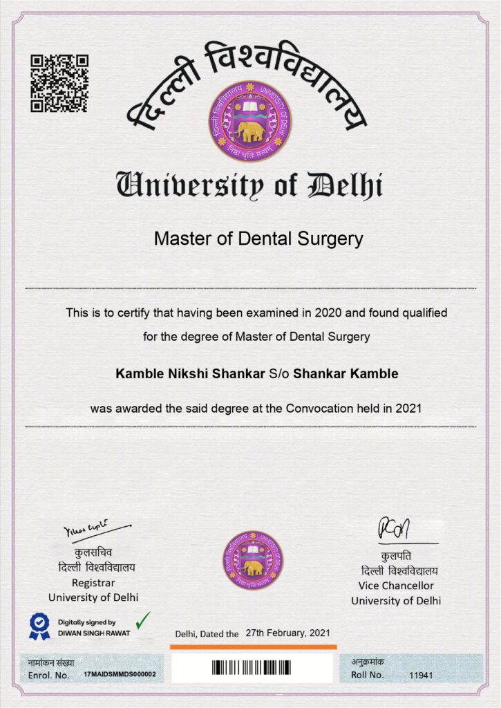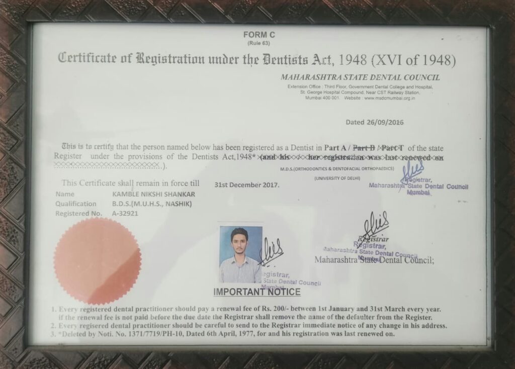 Dr. Nikshi Kamble completed his Bachelor of Dental Surgery (BDS) from the Government Dental College and Hospital, Nagpur, one of Maharashtra’s leading government dental institutions.